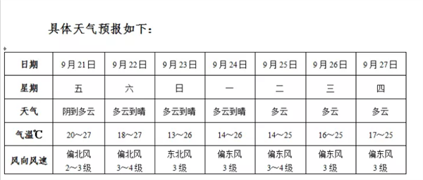 预计中秋假期期间(22-24日)以多云到晴天气为主,受冷空气影响,全市平均气温较前期下降5~7℃,23-25日早晨最低温度13~15℃。