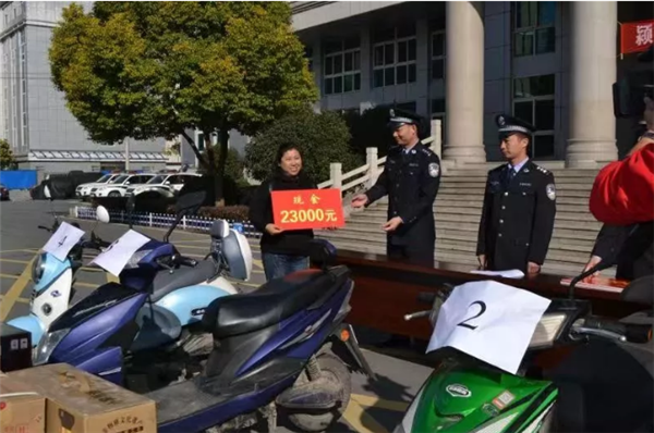 今日上午9点,颍泉分局举行了一场集中返赃大会,将近一段时期追缴的被盗、被骗财物集中返还,并以此为契机,集中向社会展示近期的打击成果。37辆电瓶车,23箱好酒以及追缴回来的现金,陆续返还给受害群众。