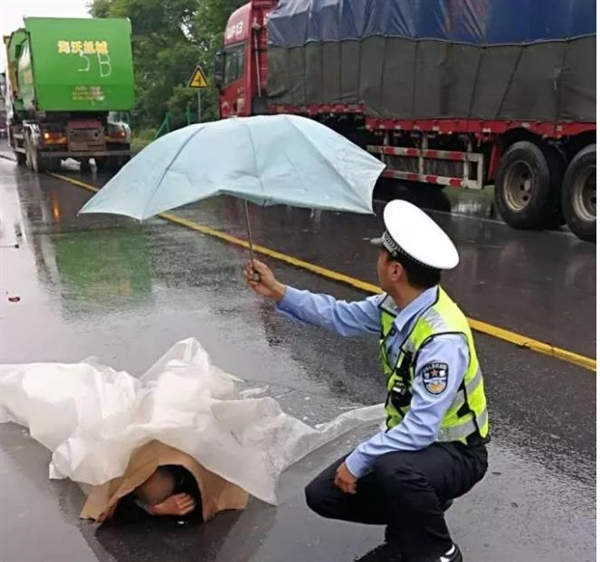 5月20日,阜阳交警三大队插花中队民警在305省道巡逻发现一车祸现场,民警先期处置,疏导道路,保护现场。天空飘雨,伤者等候救护车期间,民警找来雨布、雨伞遮雨,看护