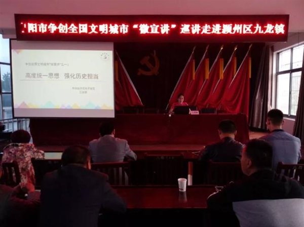 5月21日,阜阳市争创全国文明城市“六进”“微宣讲”第五小组走进颍州区九龙镇。九龙镇镇、村干部群众100余人聆听了宣讲。